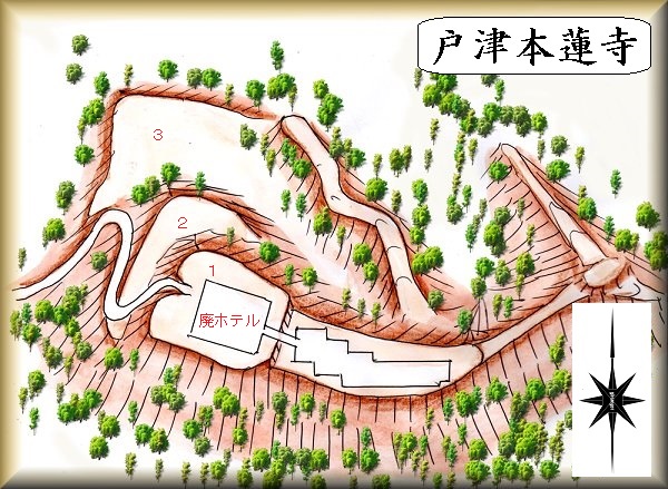 粟津温泉地の北側には、廃ホテルのある比高30mほどの独立山稜があるが、その北側山麓の一帯に戸津本蓮寺があったという。