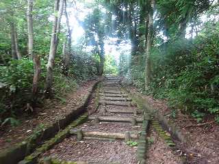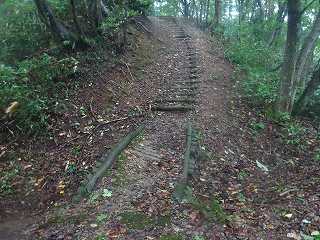 | 駐車場。ここまで山道をかなり登ってきたが、ここからも比高100mほどもある。 | 整備された階段を延々と登って行く。 |