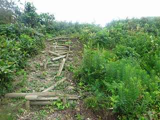 駐車場から1郭まではしっかりとした木の階段が付けられているので、それを進んで行けばよい。ところがどうしたことだろう、この木の階段、あちこちで破壊されてしまっている。自然災害で崩れたというよりは、人為的に破壊されてしまったかのように見事に崩されている。