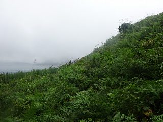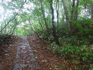そんなことを気にしながら登って行くと、やがて遊歩道は切通し状になって行く。そうしてカーブを右手に曲がったところで、突然視界が開けてきた。といってもまだ山頂ではない。山頂は正面の奥にそびえて見えている。その前には長い急斜面がある。そしてその斜面に延々と延びている階段は、やはり見事なまでに崩落してしまっているのであった・・・・。