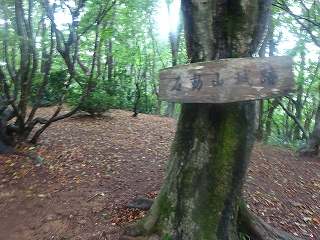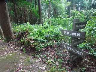 | さらに尾根まで登って行くと、梅宮の跡がある。 | 尾根上が石動山城と石動山頂との分岐点となっており、表示に従って石動山城を目指していく。 |