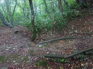 ここから東側に下っていく道が付けられていて、下の部分が横堀になっていた。横堀には木橋が架けられていたのだが、これは半分壊れてしまって埋もれかけていた。