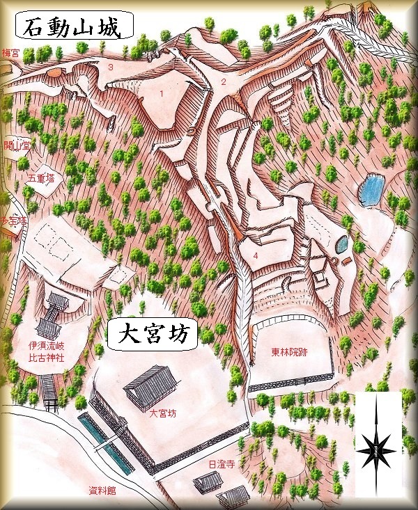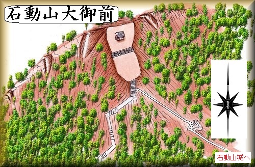 石動山城への登り口は2つある。1つは、この大宮坊の脇南側の脇から東林院の脇を通って登って行くルートであり、もう1つは、伊須流岐比古神社の西側の脇から、多宝塔跡など、いくつかの建造物跡を通って尾根に出て、梅宮からアクセスするルートである。