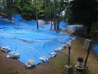 5から下に降りたところに4の平場がある。5の西側と南側とにそれぞれ虎口状の部分があり、いずれを通っても4の郭に降りていくことになる。2019年現在、4郭では発掘調査が行われているようであり、郭全体がブルーシートに覆われていた。