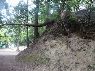 | 能登鉄道によって切り通された部分。橋を渡って東側の部分に行ける。 | 2郭の城塁。 |