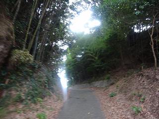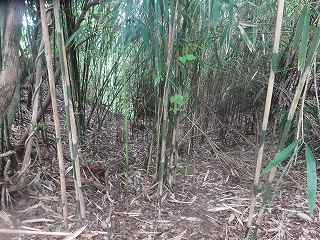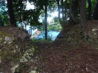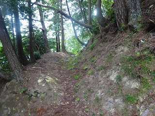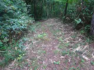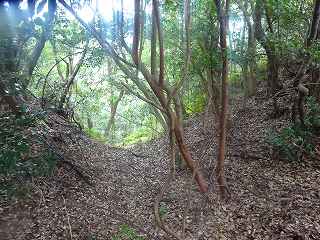 | なめり坂。ここもかつては堀の跡であったろうか。 | その先に残る堀切状地形。この先が2郭。 |
