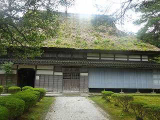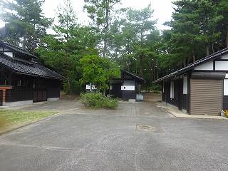 | 遠島山公園入口にある城址案内板。 | 古民家を利用した郷土資料館の背後を通って行く。 |