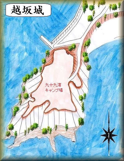 能登海洋ふれあいセンターの南西側に延びている、九十九湾キャンプ場のある城ヶ崎と呼ばれている先端部分が越坂城の跡であり、googlemapにも掲載されている。この能登海洋ふれあいセンターを目指していけばよい。
