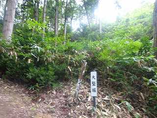 登城道を上がって行くと、そこに「大竪堀」の案内が見えてくる。ただし、竪堀そのものはヤブによってあまり明確に見ることはできない。