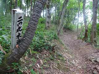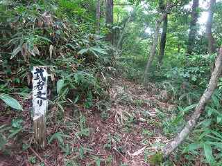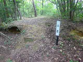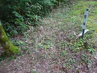 | 案内板が貼り付けられた小屋の所から登って行くと、大竪堀の案内があった。 | その先を進んで行ったところが二ノ丸木戸跡である。 |