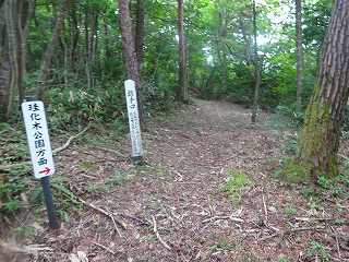 正面に平場が続いており、進んで行くとそちらには「搦手口」と書かれた案内が立てられている。ここから先は尾根続きになって、硅化木公園の方に接続していくらしい。