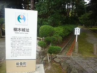 遠島山公園の入口付近には能都町歴史資料館の駐車場があるので、車はそこに停めておくことができる。公園の入口のところに、棚木城の案内板が立てられている。