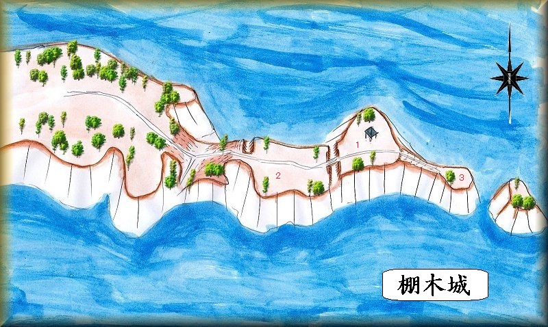 棚木城は、細長い岬を堀切によって区画した連郭式の海城である。周囲が断崖という要害地形であったので、城を構築するのは容易な場所であったと考えられる。