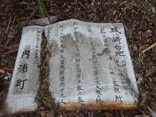 この堀底部分の脇に案内板が倒れていた。「城ヶ崎」に関する案内板である。よく見てみると、その脇には城址へと上がって行く道も付けられている。これを登って行けばすぐに城内に入り込むことができる。