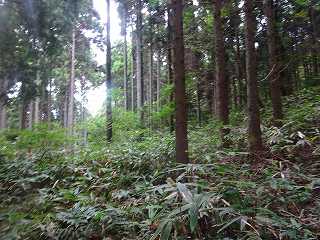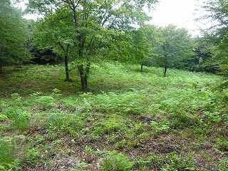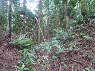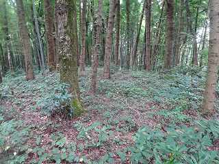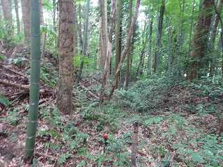 | 林道のヘアピンカーブのところにあるミラー。ここから入って行く。 | 降って東登って行ったところに平場があるが、ここではなく、北側に登って行ったところが城址であったようだ。 |