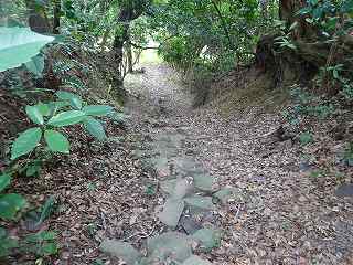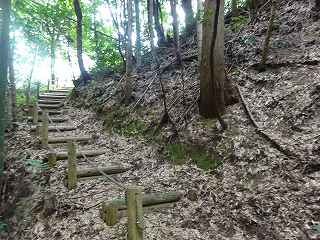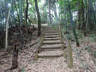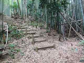 山林内部に入って行くと、その先は堀のような深い谷戸部になっており、その左手に上の段に上がって行く階段が付けられていた。これを進んで行く。