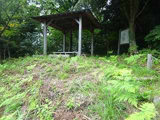 尾根を進んで行ったところには東屋があり、そこにも案内板が設置されていた。遊歩道が設置されているのはここまでであった。現地案内板の図を見てみると、遺構は山稜状に広く展開しているようだが、こちらは基本的に尾根だけであり、案内板の通りの城域の範囲であったのかどうかは疑わしい。
