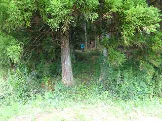 | 西来寺本堂背後の山が城址である。寺院の西側から城内への遊歩道が付けられている。 | 堀状の谷戸部の脇から馬場方向に登って行く。正面奥は堀状の谷戸部となっている。 |
