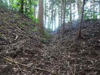 | 尾根に上がると最初に見えてくる3郭の堀切。 | 傾斜地形の3郭を過ぎたところにある1郭との間の堀切。こちらは大きい。 |