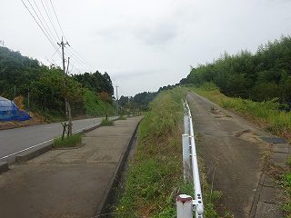 この切通しの道路の西端から、台地上に登って行く車道が付けられている。ただし、これは上の畑にアクセスするための農道のようなので、車は台地下のどこかに停めて、歩いて登った方がよいと思う。比高10mほどであるから、歩いてもすぐに台地上に到着する。