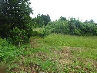 台地上は一面の畑となっていた。開墾によって遺構はほとんど失われてしまっているようだが、一部浅い堀状に窪んだ地形も見られる。これがおそらく堀の跡なのであろう。台地上を南北に区画して大きく2つに分け、東側には腰曲輪を何段か造成した城郭だったのではないかと想定できそうである。