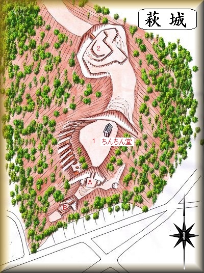 上戸町の集落の北側にそびえる比高30mほどの山稜が萩城の跡であり、googlemapにも掲載されている。