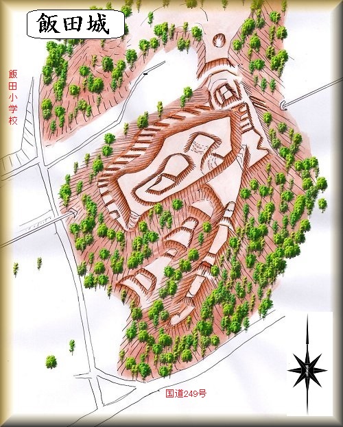 国道の北側の山稜から、その先の飯田小学校の東側にある民家の建つ谷戸部までの間が城内である。登り口が分からなかったので、今回は登城していない。右の鳥瞰図は、上記の書の図面に基づいたもので、自分で遺構を確認したわけではない。