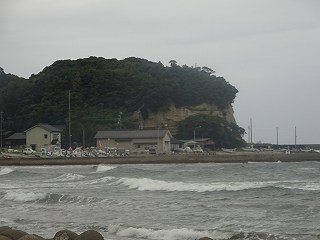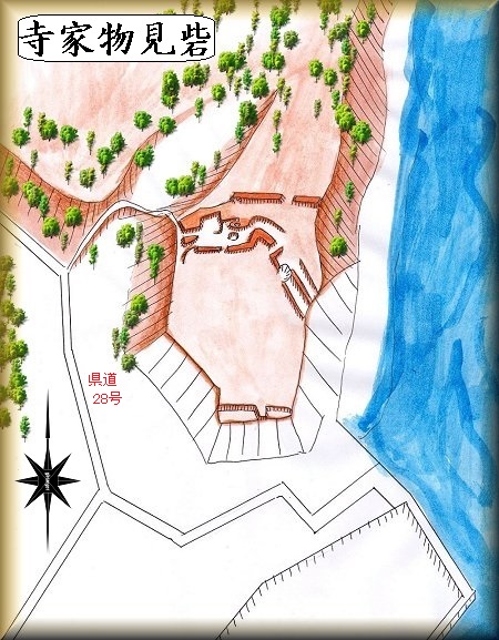 寺家物見砦は、寺家簡易郵便局の北側にそびえる比高20mほどの台地先端部に築かれている。南方から遠望すると、先端部は波に削られた断崖になっており、要害地形であったことが分かる。