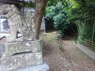 | 稲荷神社の右の狛犬の脇の暗い道路を進んで行く。 | 道が左手に曲がって上がって行くところに虎口の案内がある。 |