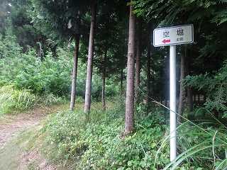 道が分かれた中央部分に「空堀」と書かれた案内が立てられている。切通し状の通路内部のことを空堀と表現しているようである。