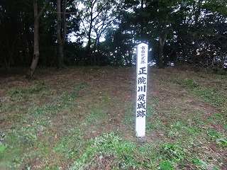 ここは畑ではなく、草刈りがされた広い平坦地となっていた。この中央奥の所に「市指定史跡 正院川尻城跡」と書かれた標柱が立てられていた。主郭とは言え、土塁などもなく、ただの平坦地のみである。