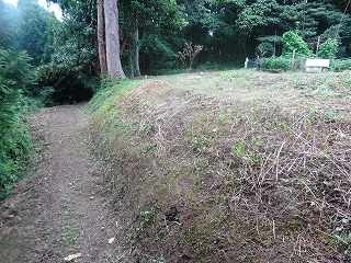 | 切通し状の部分を進んで行く。 | 正面に見えてくる空堀の案内板。この左手を進んで行く。 |