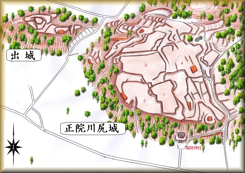 正院町の稲荷神社背後にそびえる比高20mほどの広大な台地一帯が正院川尻城の跡であり、googlemapにも掲載されている。