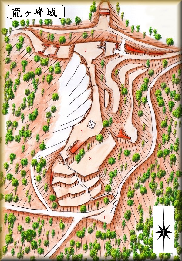 城址の東側を通っている道はかつての北陸街道であり、城への分岐点にも「←龍ヶ峰城跡公園」といった案内が出ており、これに従って進んで行けば、城址駐車場まで到達することができるであろう。