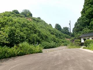 薊谷堡は、薊谷の集落の背後にそびえる比高30mほどの台地上にあった。北側の県道から台地上に登って行く車道があるので、それを進んで尾根上の部分まで行く。