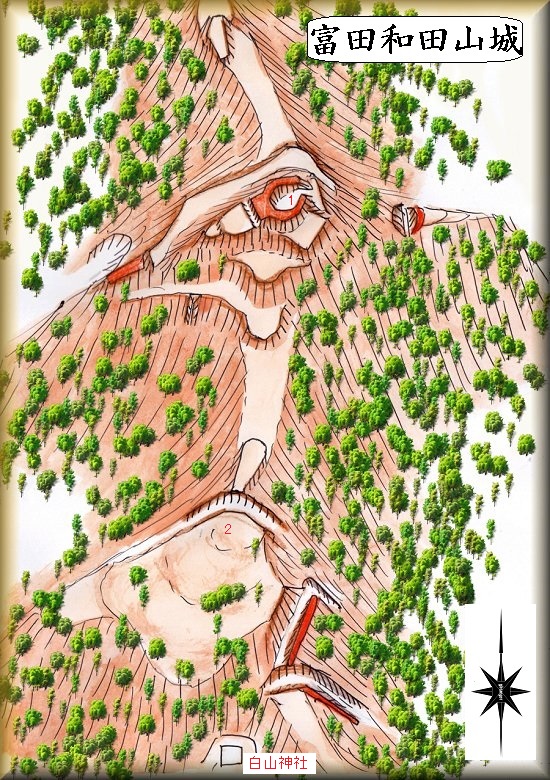 富田和田山城は富田の白山神社の背後にそびえる比高60mほどの山稜に築かれている。