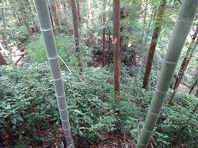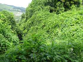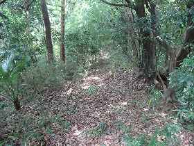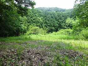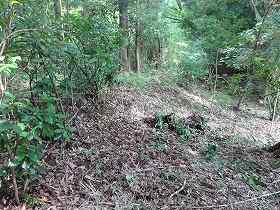 | 1郭の先端部近く。まだ先がありそうだが、夏場ではこれ以上入っていけない。 | 西側に残る堀切の名残。深さ4m、幅6mほどある。 |