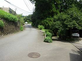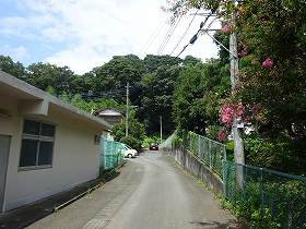 | 先端下の堀切。深さ10mほどもある鋭い切岸となっていて、とても降りられない。 | 国道から城内に入る入口。右側の民家が副郭と思われる場所である。 |