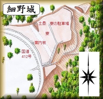 現在、城の西側を国道412号線が大きくカーブを描いているが、この国道も切通し状態になっている。あるいは、ここにも堀があって二重構造になっていた可能性もあるだろう。案内板によると「本丸」「二ノ丸」といった地名が残り、国道の建設によって堀切が消滅した、といったことが書かれており、また城域は、東西130m、南北240mほどもあったというから、国道に沿うようにして二ノ丸の堀が存在していたのであろう。