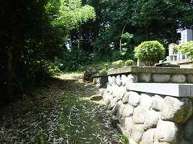 中学校の敷地の西側側面部を突き当りまで進んでいくと、山道が見えてくる。そこから上がるとすぐに墓地がある。墓地の背後は城塁状の土手になっている。