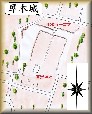 厚木城は、旭町2-11-19番地にある智恩神社の一帯に築かれていた。境内はわりと広くなっており、駐車することも可能である。市街地の城址としてはとてもありがたい。