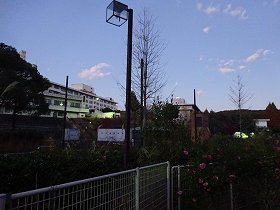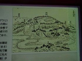 | リハビリセンターのある台地。かつてここに七沢城があった。すっかり暗くなってしまったのだが、デジカメではそれなりに撮影できる。 | 案内板にあった古城図。 |