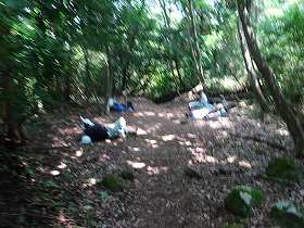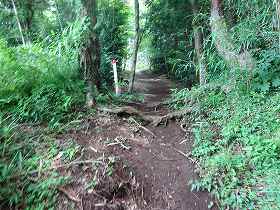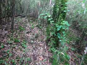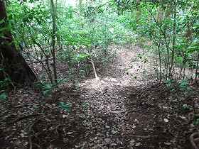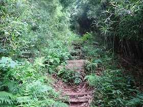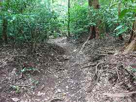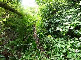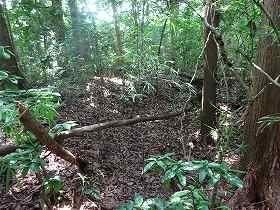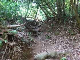 | 急傾斜をひたすら直登する階段。ジグザグの山道を付けようなどという妥協は一切ない。 | 砦の南側の堀切の痕跡。 |