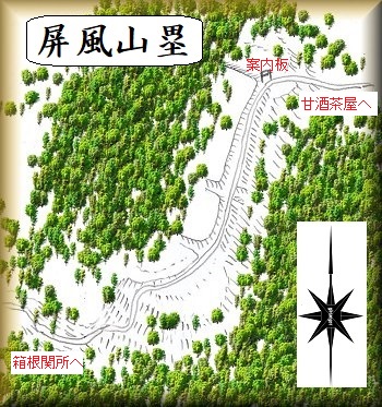 屏風山塁は、箱根関所を見下ろす比高210mの屏風山の山頂に築かれていた。