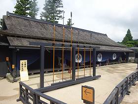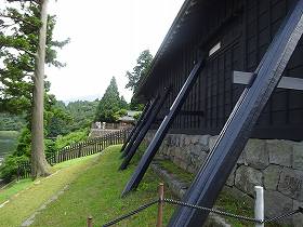 | 大番所の建物の外側。倒壊防止の柱木が立てかけてある。 | 足軽番所越しに遠見番所を見る。 |