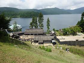 箱根の関所は、恩賜箱根公園のすぐ南側にある。すぐ近くには土産物屋さんなどがたくさんあり、芦ノ湖の観光船の発着場もある。観光地である。。