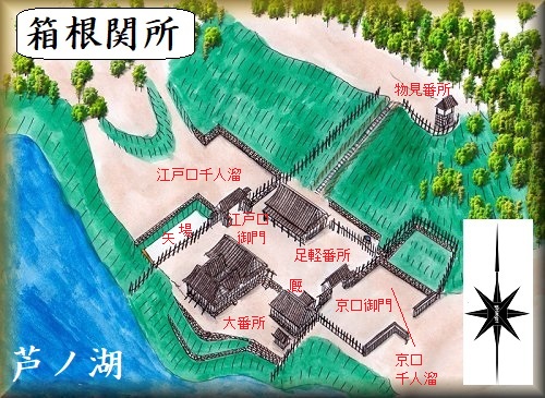 西側には芦ノ湖があり、東側には屏風山がそびえている。この2つによって地形が狭間状に細長くなった空間を東海道が通っている。このわずかな空間を閉じてしまえば、先に進むのが難しくなる。関所を置くのにふさわしい地形になっている。