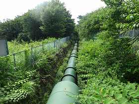 | 城址に架かる橋の上に立てられた案内板。 | 城内中央を送水管が通って南北に分断している。 |