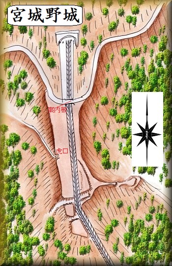 宮城野城は、この南北に細長い地形を分断して城域を確保したものである。ただし、尾根基部に当たる北側部分には、当然あるべきはずの堀切が見られない。送水管の工事によって破壊されてしまった、と見るのがよさそうである。