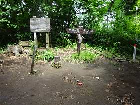 ともあれ山頂に到着だ! ところが、山頂とはいえ、まったく見通しが利いていない。周囲はひたすら笹薮の波である。これでは山頂からの景色を楽しみにして登ってきた人はがっかりしてしまうだろう。景色の見えないハイキングコースなど意味が分からない。